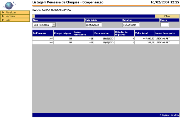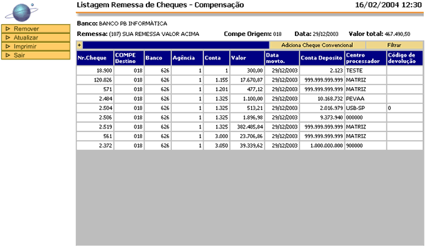 Permite controle de talonário de cheques das empresas do banco, estatísticas, acompanhamento de custos, controle, emissão e baixa de cheques, contabilização e relatórios gerenciais.